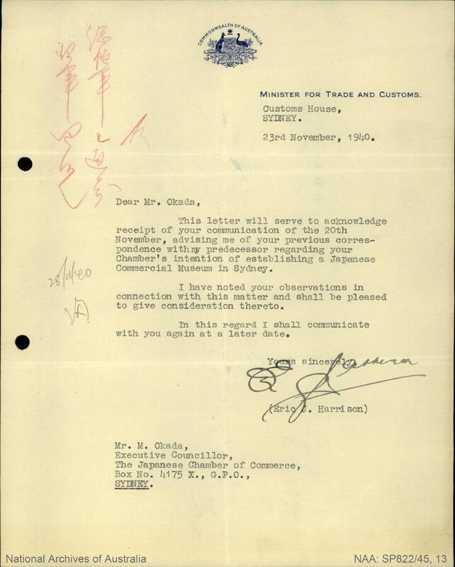 - Japanese Chamber of Commerce - letters from Australian Government Ministers (enemy property records) [box 4A]