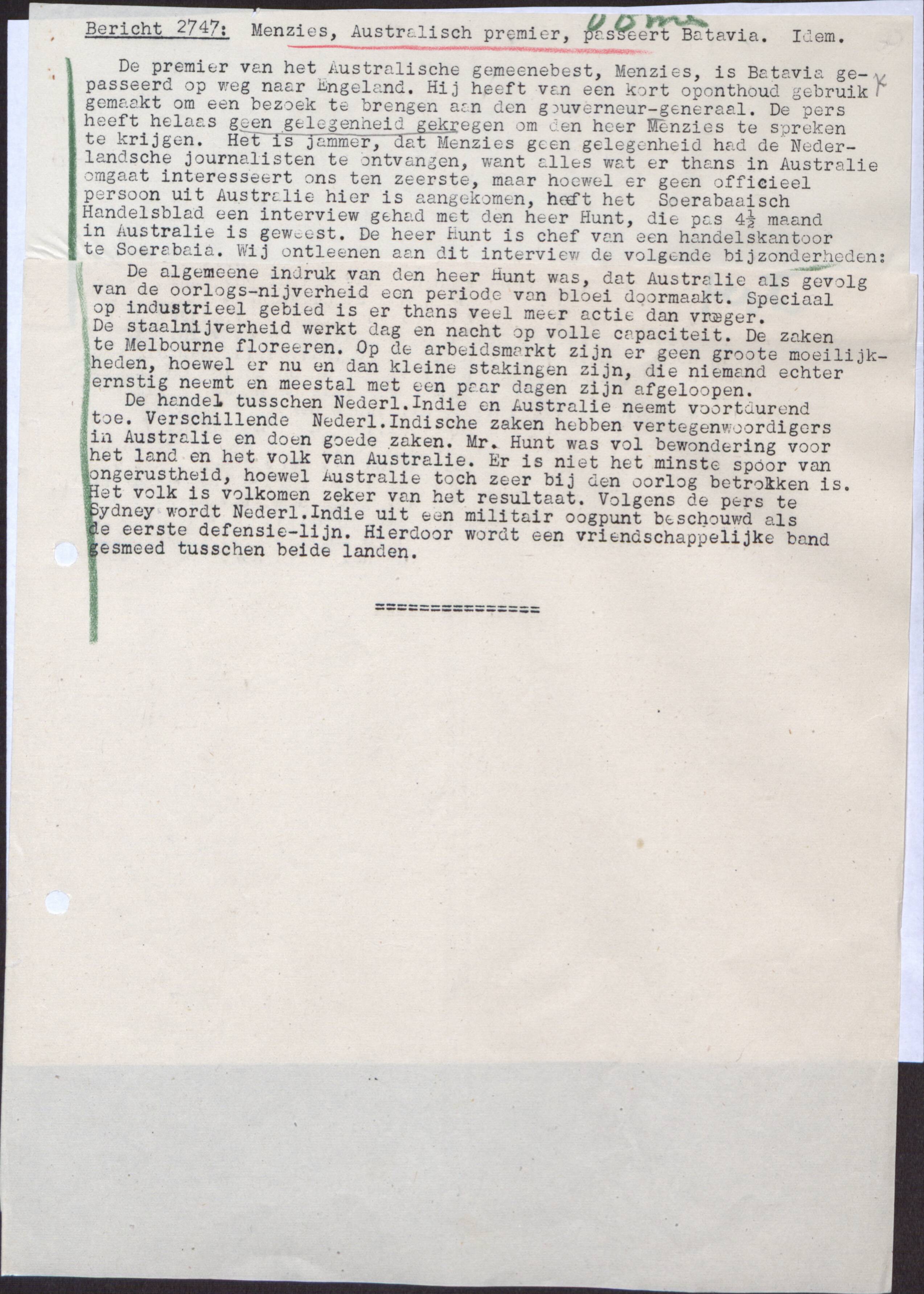 | Menzies, Australisch premier, passeert Batavia | Text |