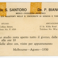 "Joint business card from the office of Dr Soccorso Santoro. “DR. S. SANTORO DR. P. BIANCHI / MEDICI – CHIRURGHI – OSTETRICI / GIA’ ASSISTENTI NELLE R. UNIVERSITA’ DI GENOVA E TORINO […]”.