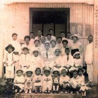 Japanese Buddhist School, Second Anniversary. Broome, 1920. Rita (Mitsue) Ishii, Kathleen (Musuko) Murakami, Agnes Ellies, Kojiro Mise, Saburo Mise, Fujie Seto, Joseph Chi, Helen San, Gertrude Chi, Kitakawa Tonden, Buddhist priest, Tomiye Seto, Charlie Ellies, Toyosaburo Mise, James Chi, Kikuye Mise (?), Mrs Tokumaru (?), Yae Yamamoto (Chi), Theresa (Shigeno) Murakami, Yasukichi Murakami, Frank (Yasunosuki) Murakami, Kaichiro Sakai.