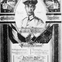 Poster for the concert at Berrima Internment Camp to mark the birthday of Crown Prince Friedrich Wilhelm on 6 May 1917, held in the Deutches Theater, Berrima and performed by the internees. The poster was designed and drawn by Otto Monkedieck a POW from the ship Emden.