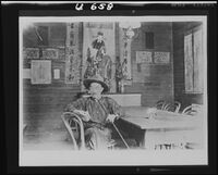 U658 [Historic photograph of a chinese man reading and smoking, in a decorated room] -