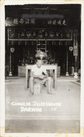 Man sitting in Darwin Chinese Joss House with Chinese -